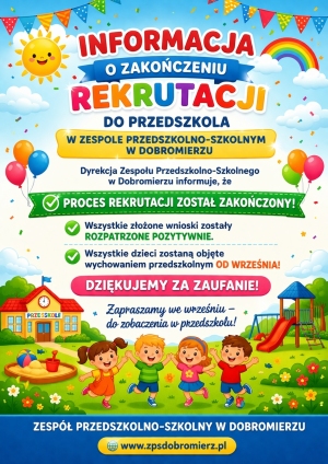 Dyrekcja Zespołu Przedszkolno-Szkolnego w Dobromierzu informuje, że proces rekrutacji do przedszkola na nowy rok szkolny został zakończony.